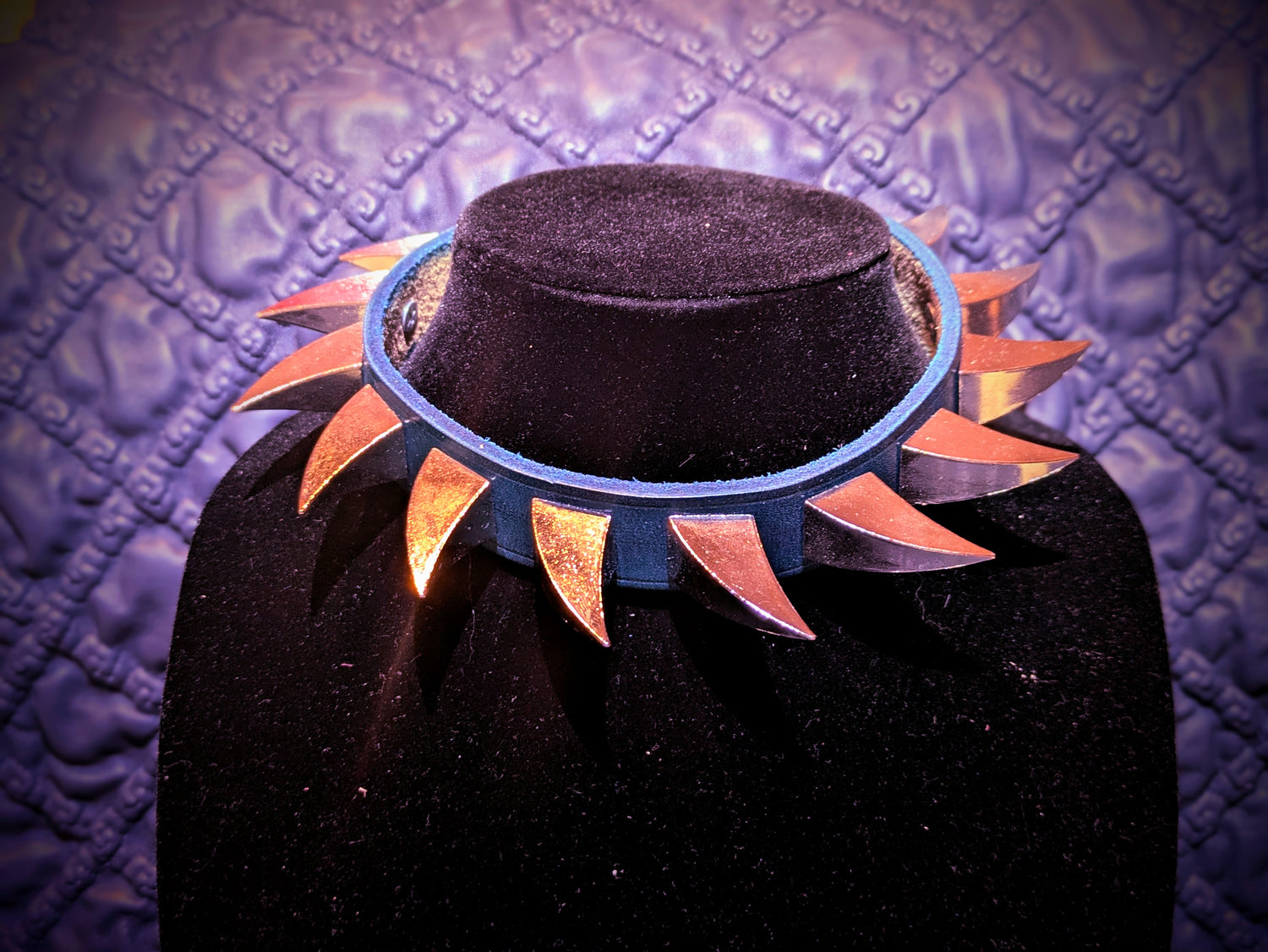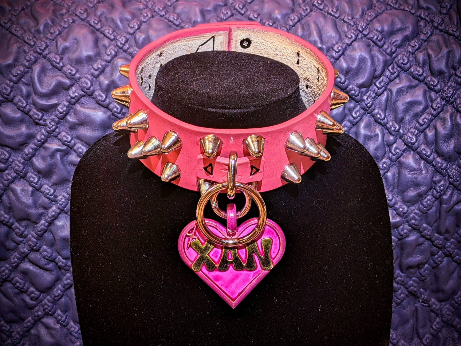 A 2" wide heavy duty collar featuring 26 English cone spikes, an anchor O-ring, and custom 3D printed and painted pet tag!