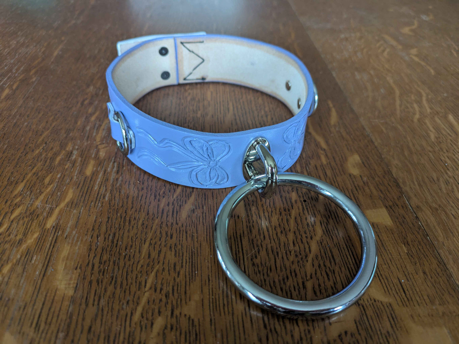 2" Heavy duty painted leather collar in lavendar with large bondage O-ring on front. Bows have been embossed on the sides!