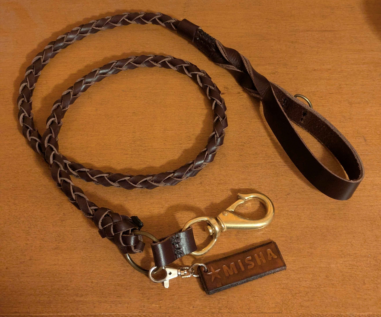 Misha's long round-braid leash with custom embossed tag and bag clip.