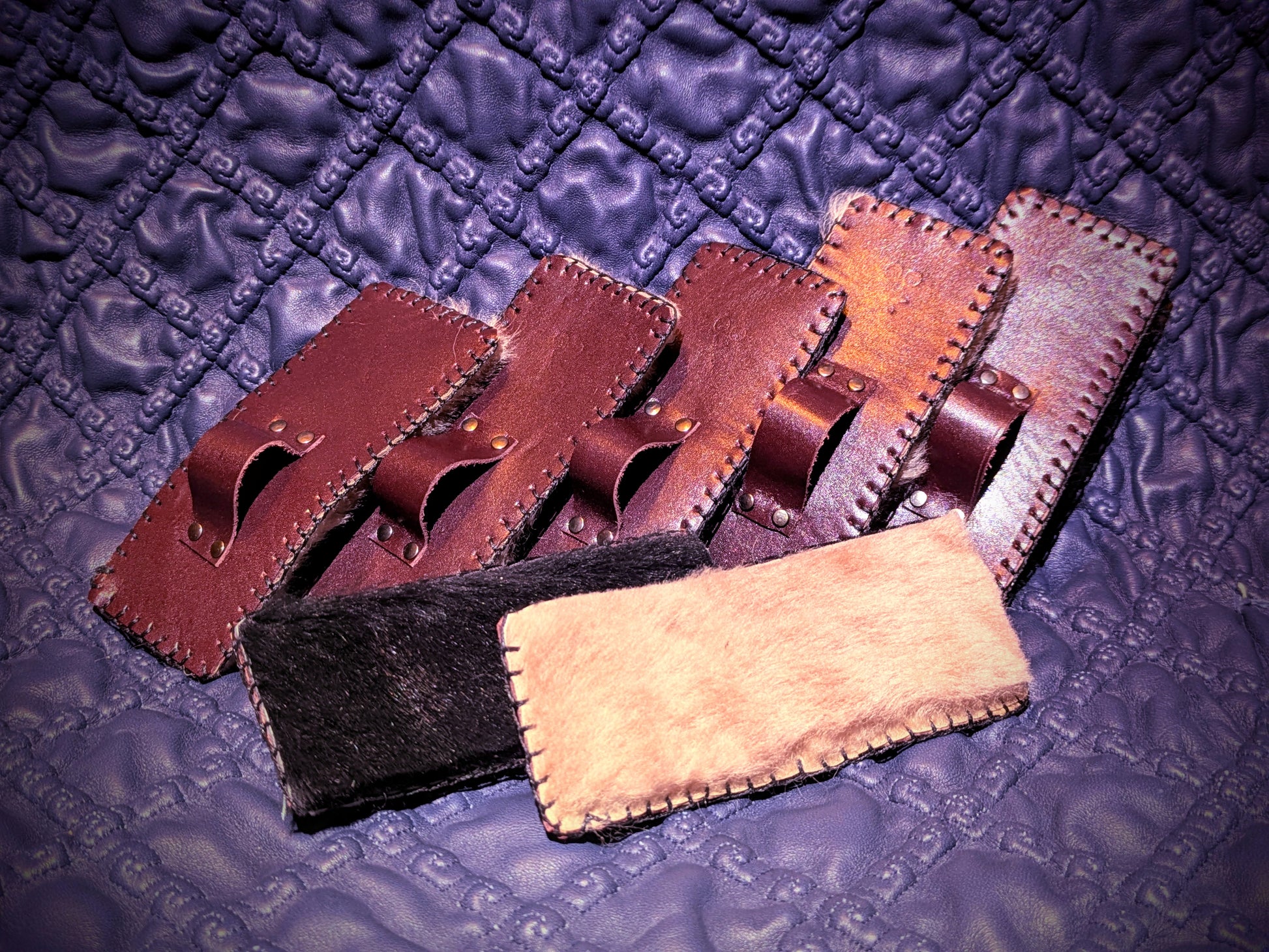 2x5" delightfully soft sensory 'brush' perfect for aftercare. Lamb fur and leather with a blanket stitch edge, with riveted finger loops.