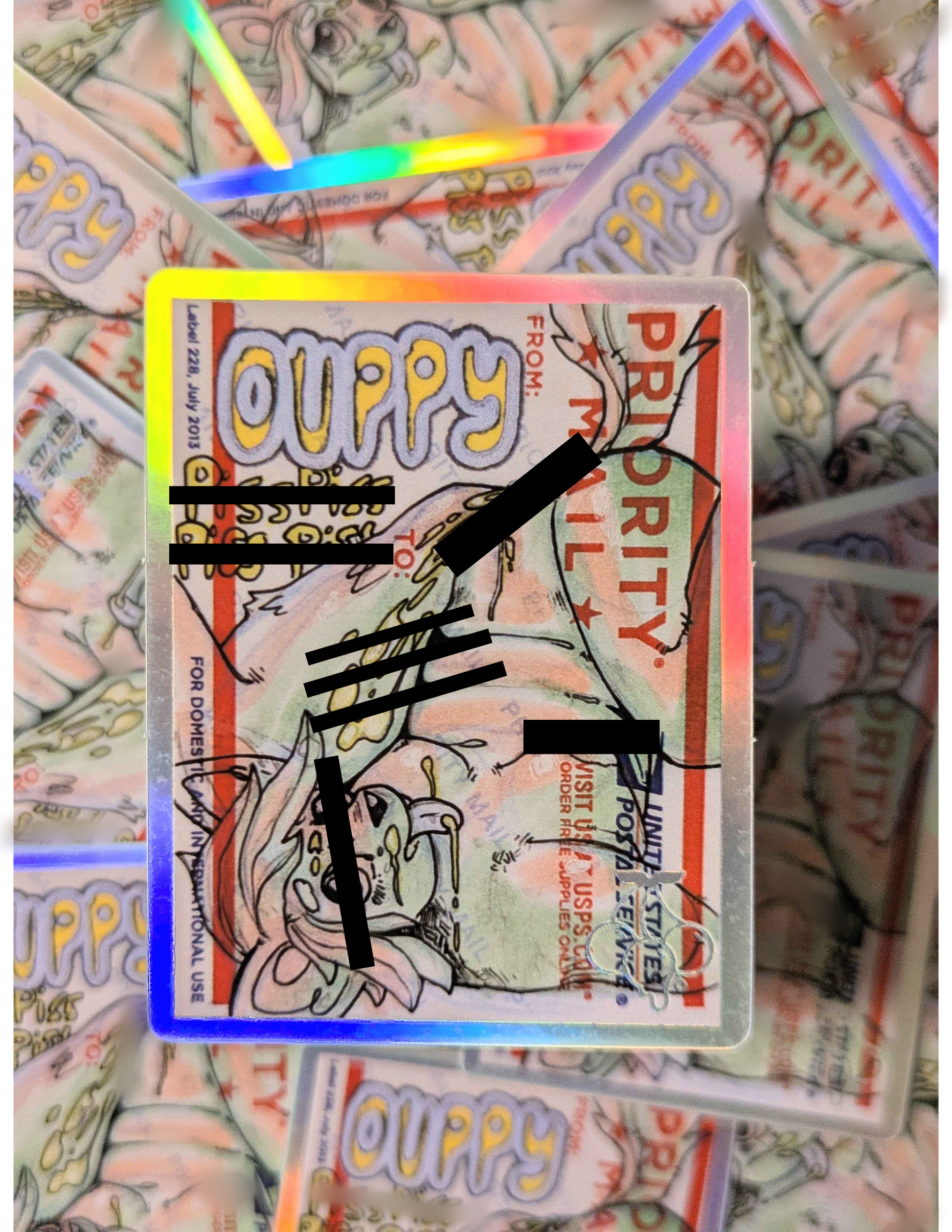 2" x 2.6" Rainbow Chrome edge sticker picturing a naked dog. You can find an uncensored version on my instagram @Buppy_Melon!